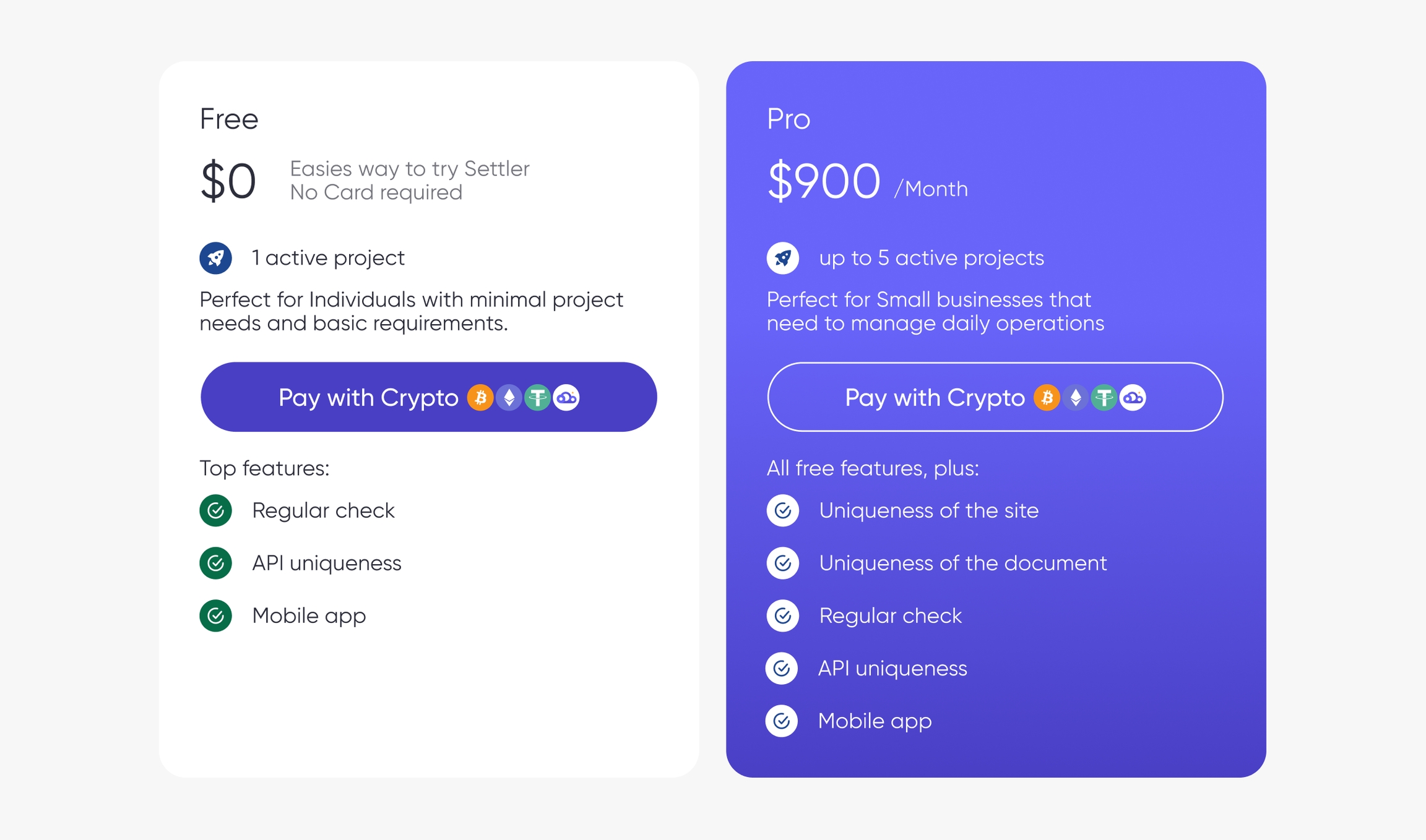 On the plans page, CryptoCloud branded buttons can be placed below each list of services or packages, allowing customers to immediately select and pay for the preferred plan with cryptocurrency. The buttons should be prominent but not interfere with the comparison of different tariffs.